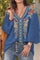 Blue Graphic Tops V-neck Long Sleeve Floral Printed Casual Blouse