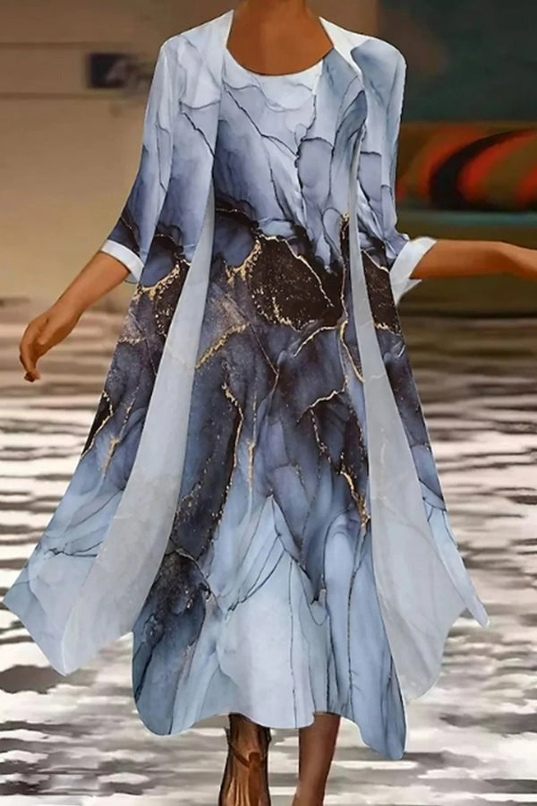 Zweiteiliges Set aus bequemem, lässigem Damenmantel mit Rundhalsausschnitt, Dreiviertelärmeln und Rock (zufällig gemustert).