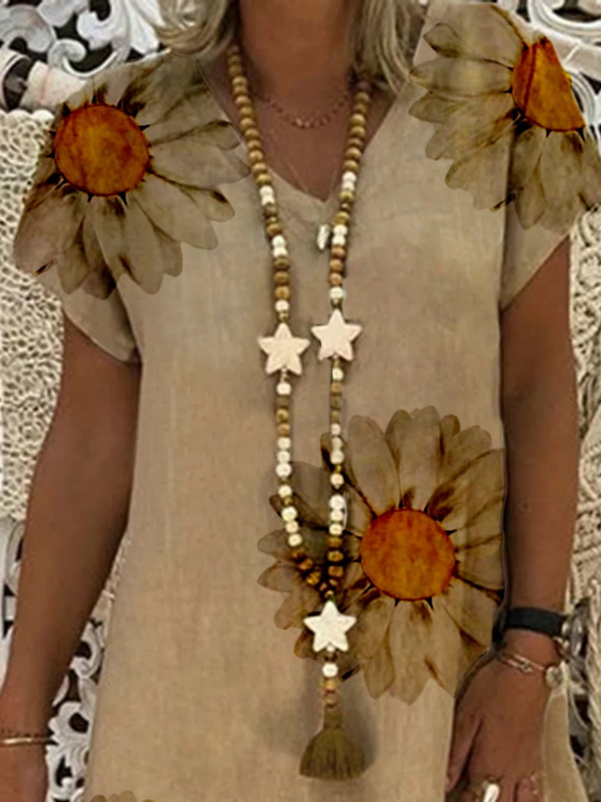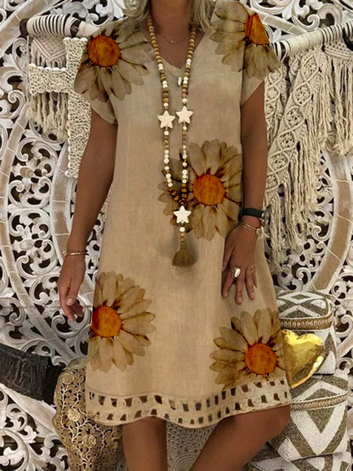 This khaki V-neck short-sleeved mini dress is made of smooth and breathable polyester fabric, perfect for spring and summer. The retro sunflower print adds a touch of vibrancy, the V-neck design flatters the neckline, and the cutout details at the hem add a touch of sophistication. The loose fit is comfortable and relaxed. It can be paired with a straw bag and flip-flops for a relaxed vacation look, or with canvas shoes for a casual everyday feel. It's a versatile piece that combines retro style with practicality.