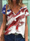 This American flag print V-neck short sleeve T-shirt brings a bold yet casual statement to your everyday wardrobe. Made from a soft polyester-spandex blend, it offers a lightweight, stretchy, and comfortable fit. The relaxed silhouette and breathable fabric make it ideal for spring and summer. Easy to pair with jeans or shorts for holidays, weekends, or casual outings.