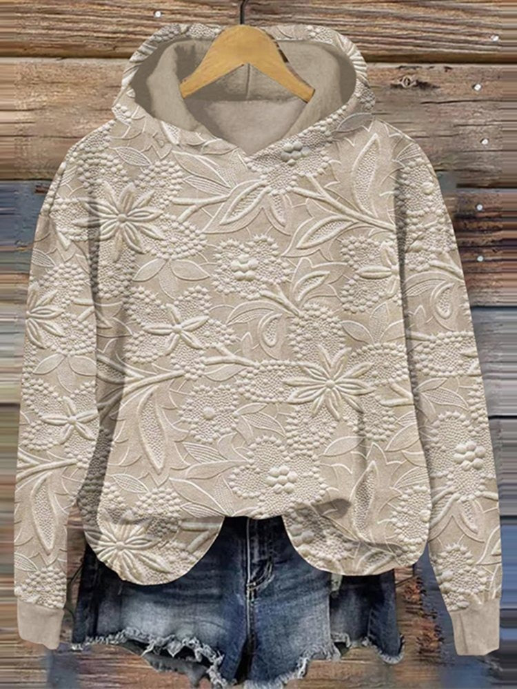 This brown floral textured hoodie is made from soft, skin-friendly cotton. The 3D embossed print gives it a retro feel, and the loose fit offers comfort and a relaxed look. Pair it with denim shorts and combat boots for a perfect autumn outing, or with leggings and sneakers for an easy daily commute. It's a versatile piece that combines style and comfort for autumn and winter.