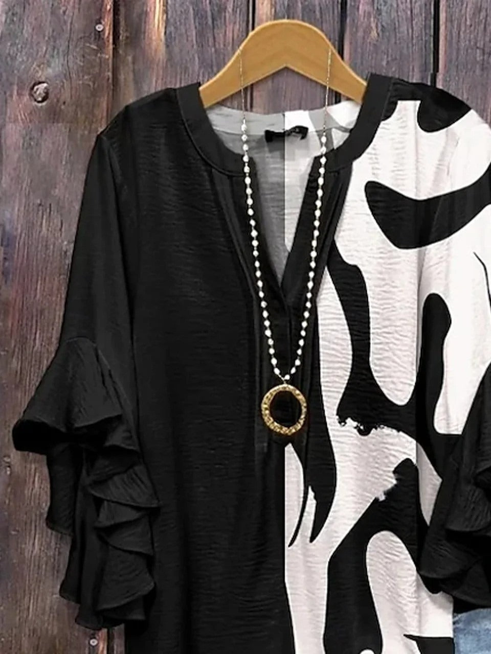Abstract Pattern V-neck Frill Half Sleeve Loose BlouseAbstract Pattern V-neck Frill Half Sleeve Loose Blouse